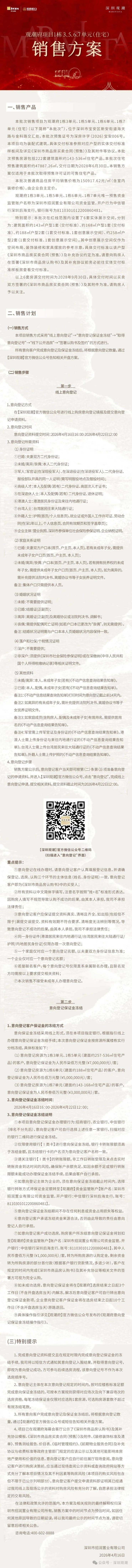 提示:本广告为要约邀请,不构成要约,所有文字、图片仅供参考,所有内容均以政府最终审批文件和买卖双方签署的《商品房买卖合同》及附件、补充协议约定为准,没有约定或约定不明的以实际交付为准;开发商在法律允许的范围内保留修改的权利,敬请留意最新资料。项目推广名为【深圳观潮】,备案名为【观潮府】本资料发布时间为2026年4月,开发商名称:深圳市招润置业有限公司。