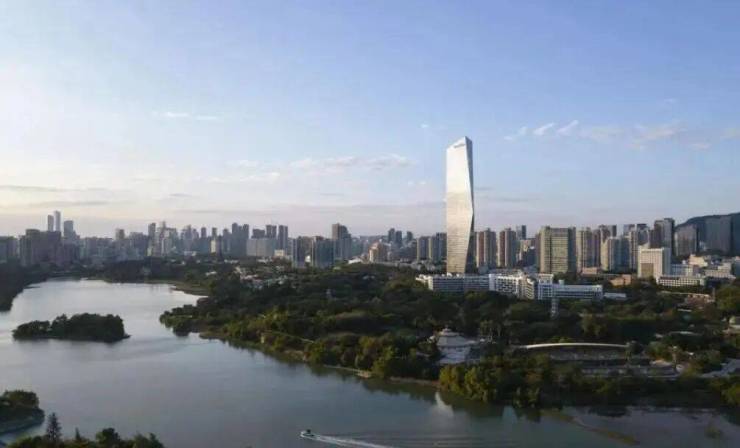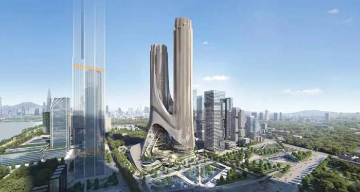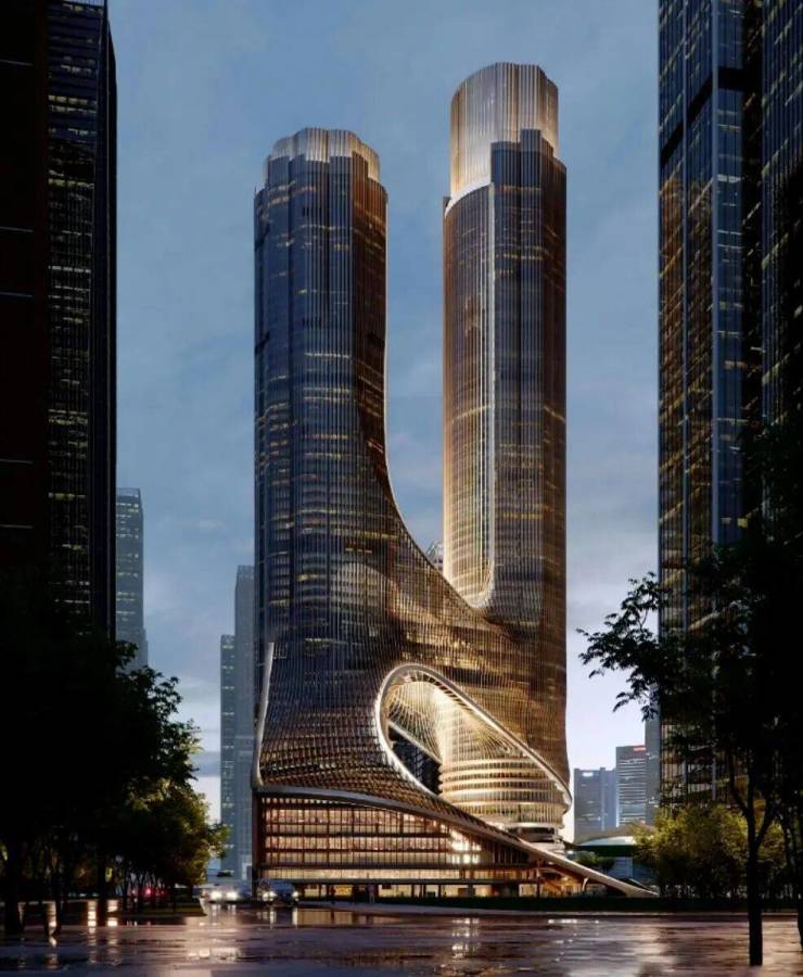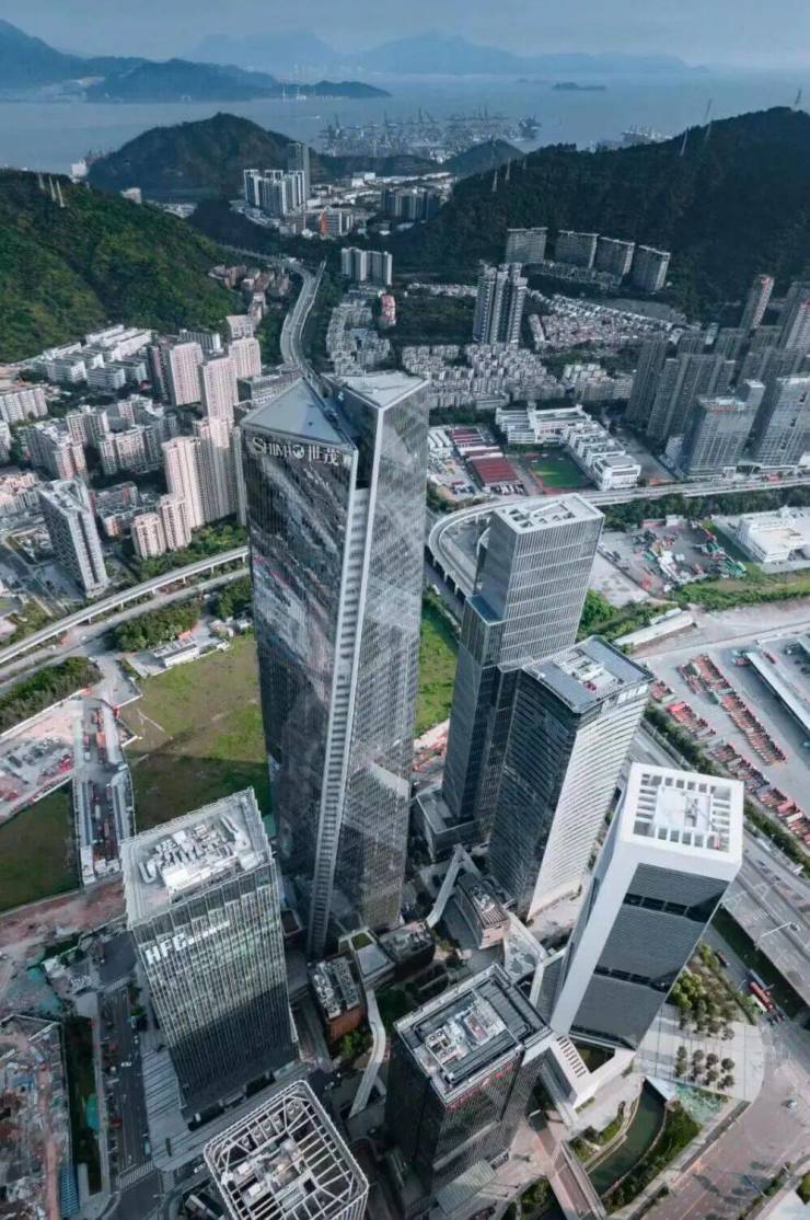 深圳湾超级总部基地 C 塔(东塔)位于南山深圳湾超级总部基地核心区,是片区重磅超高层双子塔建筑,东塔高 394 米共 72 层,为目前深圳湾超总在建最高办公地标,预计 2026 年正式投用。项目由扎哈・哈迪德建筑事务所设计,以 “双人起舞” 为设计灵感,双塔楼在 120 米高空由非对称复杂连廊相连,流动线条搭配 “生态梯田” 设计,让中央绿轴的绿意从裙房延伸至塔楼,兼具艺术感与生态性。