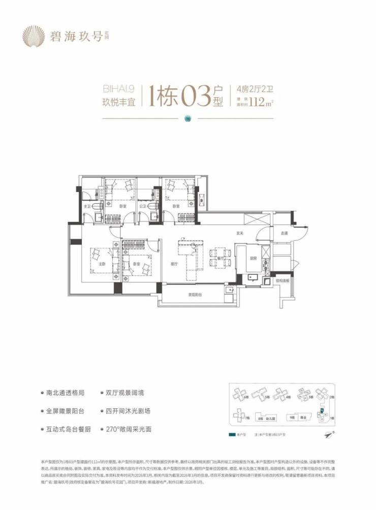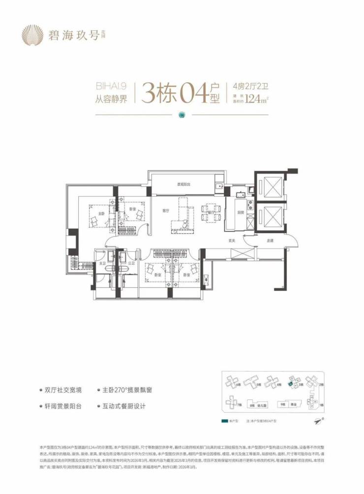特别说明:本宣传资料为要约邀请,不构成要约和承诺。所示内容仅供参考,一切内容以政府最终批准文件、买卖合同及补充协议为准,如有变化恕不另行通知;本宣传资料文字、图片所表述的内容与实际可能存在一定差异;本宣传资料文字、图片所示内容在建设过程中可能会因政府及其下属单位或公共事业单位的要求等原因而变更;本宣传资料对项目周边环境、交通、商业、公园、医院、文化设施及其他公共设施的介绍,仅供参考,一切以政府相关文件及实际情况为准;本宣传资料关于项目的学区划分和学位申请条件以政府教育主管部门和相关学校的最终文件为准,本公司对此不作承诺,关于学区划分和学位申请的条件须前往主管部门及学校进行咨询。敬请阁下在选择购买房屋前,亲临现场,对周边环境仔细考察后再做购买决策;本公司保留对本宣传资料修改的权利,敬请留意最新资料。项目推广名:碧海玖号,备案名:碧海玖号花园,项目开发公司:深圳市锦新明集团有限公司。制作时间2026年4月。
