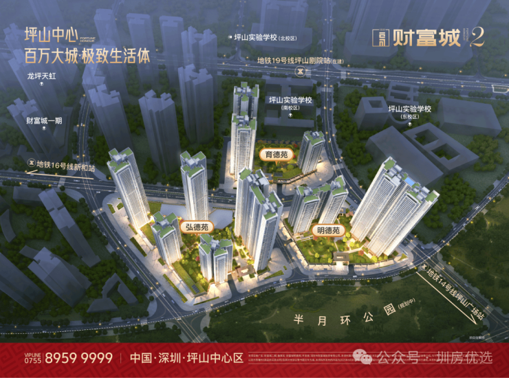 财富城2期所在的区位是整个坪山最核心的地段,汇聚了高铁+14/16号线双地铁+坪山实验学校+坪山中心公园+坪山天虹商场+坪山区政府+坪山体育中心+坪山图书馆,文艺馆等等,所有的市政配套基本都集中在这里,并且财富城2期也是该核心区域内唯一在售的新盘。