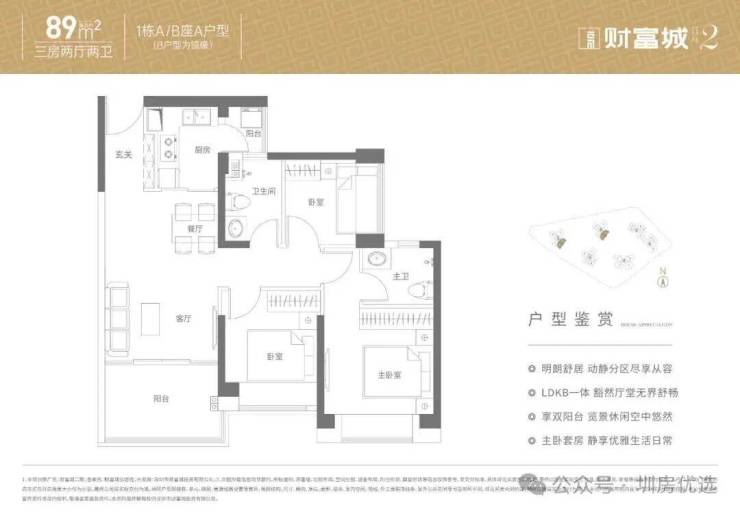 89㎡的3房2厅2卫,设计的是经典竖厅格局,客厅实测3.2米开间,LDKB一体化设计,动静分区,分别做到了主卧12.35㎡/次卧8.22㎡/次卧6.19㎡(实测面积,去掉墙体),L型厨房,卫生间干湿分离,带1个小生活阳台,得房率约:72.3-77.7%(不含赠送),西南或东南朝向。赠送面积8.3㎡,加上赠送得房率81.63-86.9%。