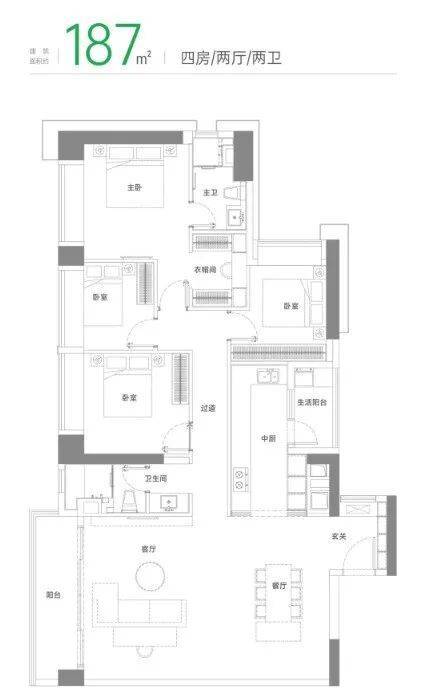 B户型:118㎡户型的放大版,3/4单元的西南向的中间位置。户型整体尺度会比118㎡的大一点,厨房多个生活阳台,主卧是暗卫,公卫和厨房采光差。