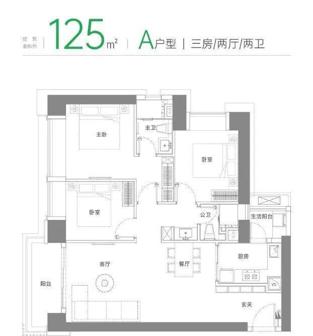 A户型:传统的三房两厅两卫,动静分区户型,厨房带生活阳台。房间做得相对均衡。也是货量最多的户型