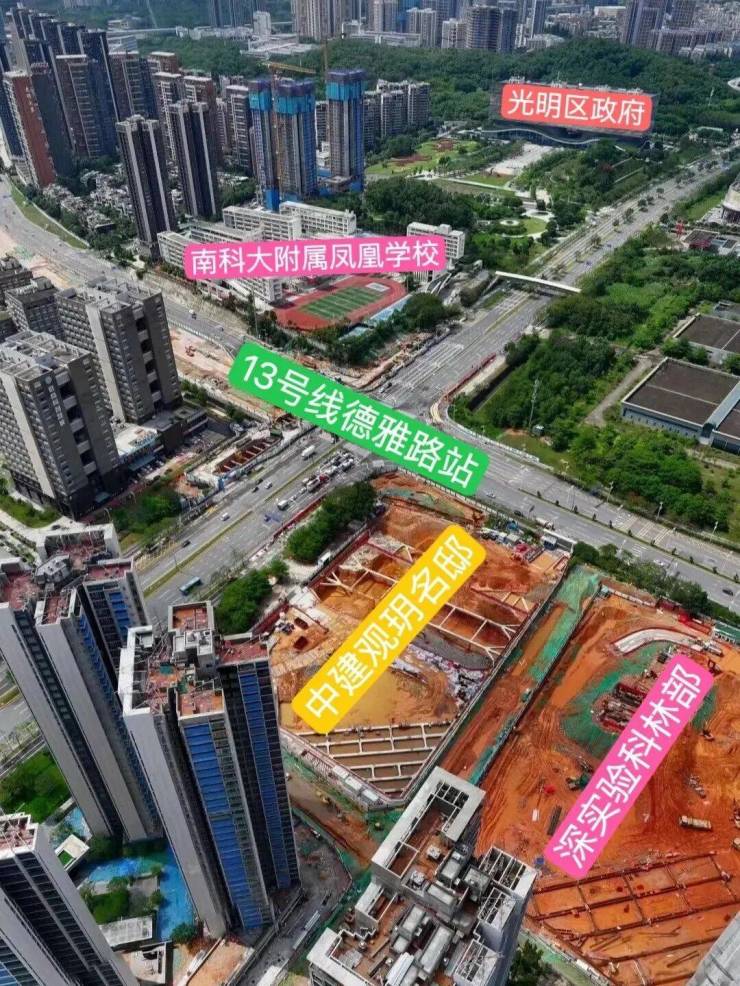 中建观玥名邸,位于光明区凤凰街道光侨路与观光路交汇处东南侧,地处光明科学城核心区与凤凰城板块交汇处,是光明高铁站板块最后一块住宅用地。作为光明科学城"一心两区"战略布局中的关键节点,项目紧邻区政府、文化艺术中心等行政文化配套,2公里范围内覆盖蓝鲸世界、万达广场等成熟商圈,坐享"15分钟社区生活圈"便利。依托光明科学城建设世界级原始创新高地的规划,项目所在区域将受益于大量高端科学人才涌入带来的区域价值提升,同时享有"北林、中城、南谷"差异化城市风貌中的"乐活城"特质,兼具科技感与宜居性。
