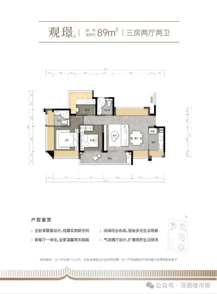 89㎡的3房2厅2卫,1栋04户型,设计的是横厅南北通透格局,客餐厅5.4米开间,LDKB一体化设计,分别做到了主卧16.02㎡/次卧9.07m²/次卧8.26㎡(包含墙体飘窗),客厅连接次卧出9.3m²的巨幕大阳台,L型厨房,卫生间干湿分离,得房率约79.1%(不含赠送),阳台主朝西南向。套内面积70.03m²+赠送面积21.17m²=实用面积91.2m²,加上赠送面积后得房率102.95%。