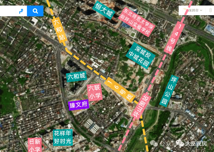 臻文府位于坪山中心区六和城旁边,东纵路与迎春路交汇处,项目北侧紧挨着一期六和城,东侧是六联小学,南侧是坪山综合批发市场,西南侧是花样年好时光。