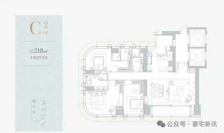 1C栋(1栋三单元)-51层:4梯3户,约210㎡,为一期的入门级户型,一层三户。