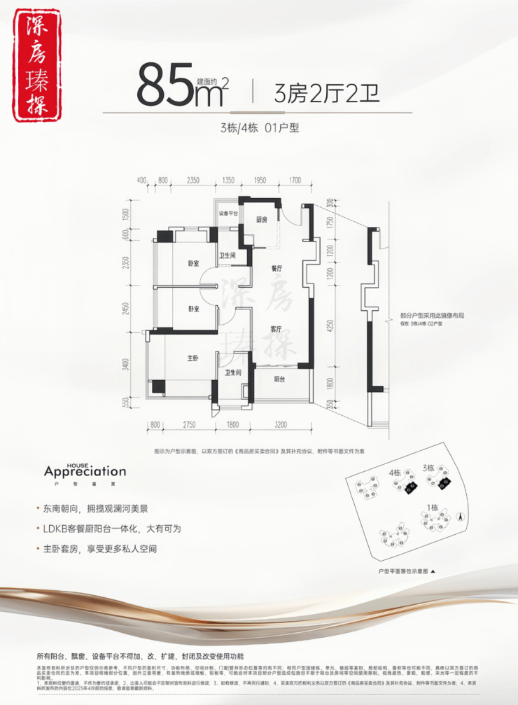 85㎡的3房2厅2卫,设计的是竖厅格局,客厅3.2米开间,LDKB一体化设计,S墙设计预留冰箱卡槽位,动静分区,三开间朝南,分别做到了主卧16.41㎡/次卧7.71㎡/次卧7.4㎡(包含墙体飘窗),U型厨房,公卫三段式分离还带2㎡的设备平台,得房率约:97%(包含赠送),东南朝向看观澜河景观。