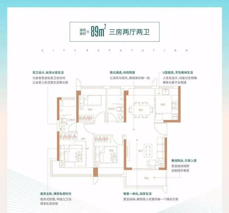 89㎡的3房2厅2卫,5栋02户型,设计的是经典竖厅格局,客厅3.6米开间,LDKB一体化,动静分区,三开间朝南,主卧270°转角飘窗,U型厨房,卫生间干湿分离,得房率:74.71%(不含赠送),西南或东南朝向。