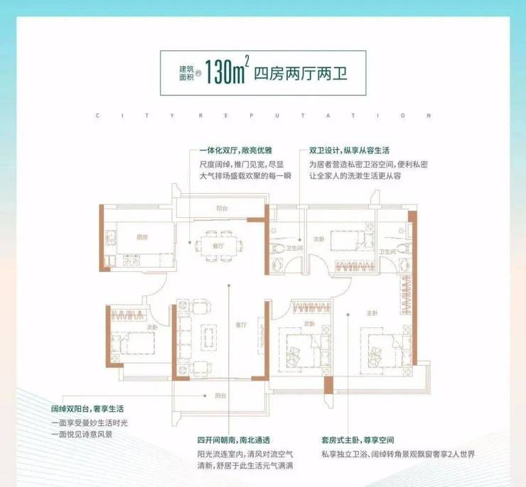 130㎡的4房2厅2卫,设计的是竖厅南北通透格局,客厅4.1米开间,一体化双厅双阳台,四开间朝南,主卧270°转角飘窗大套间设计,U型厨房,卫生间干湿分离,得房率:78.43%(不含赠送),阳台主朝东南向。
