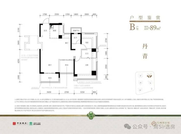 89㎡的4房2厅2卫,设计的是经典竖厅格局,进门入户玄关,客厅3.45米开间,动静分区,三开间朝南,分别做到了主卧14.54㎡/次卧7.96㎡/次卧7.56㎡/次卧5.8m²(包含墙体飘窗),主卧+1个次卧270°飘窗,U型厨房,公卫三段式干湿分离,得房率约102.2%(包含赠送),阳台5.52m²西南或东南朝向。飘窗赠送面积13.17m²+阳台赠送面积6.61m²+设备平台1.8m²=实际赠送面积约21.58m²。