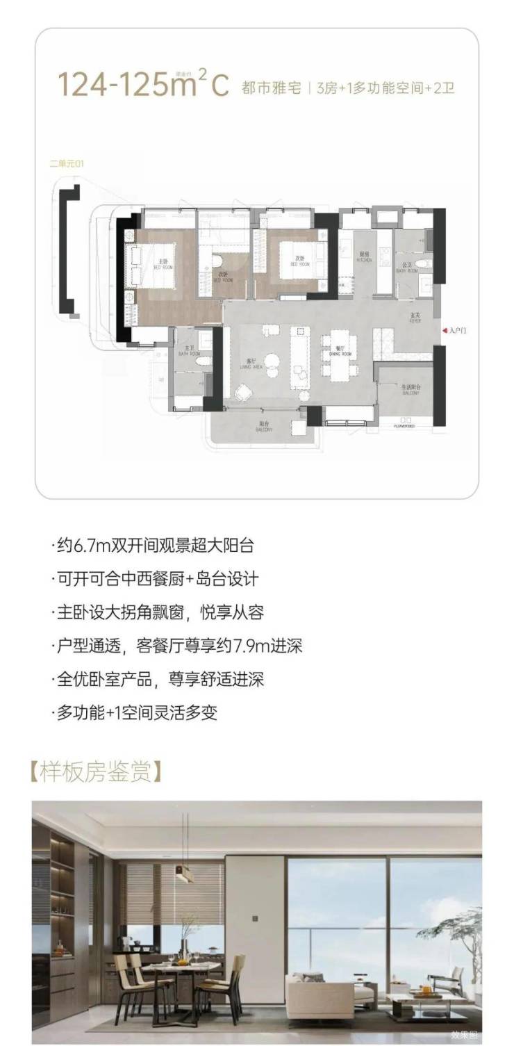 这个户型是顶配户型,主打无敌景观和红树林景观。南面可看香港和深圳湾景观,四面环景,景景不一样的别致。层高约3.5米,南向主阳台开间长约9米,270°极限观景。