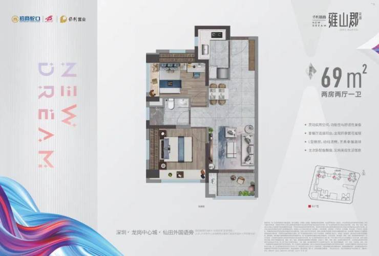 69㎡的2房2厅1卫,设计的是竖厅格局,客厅2.77米开间(实测),LDKB一体化设计,进深9.62米,主卧双飘窗,2个卧室分别做到了主卧10.2㎡/次卧8.87㎡(实测面积,去掉墙体),L型厨房,卫生间干湿分离,得房率约70.9%(不含赠送),西南朝向。