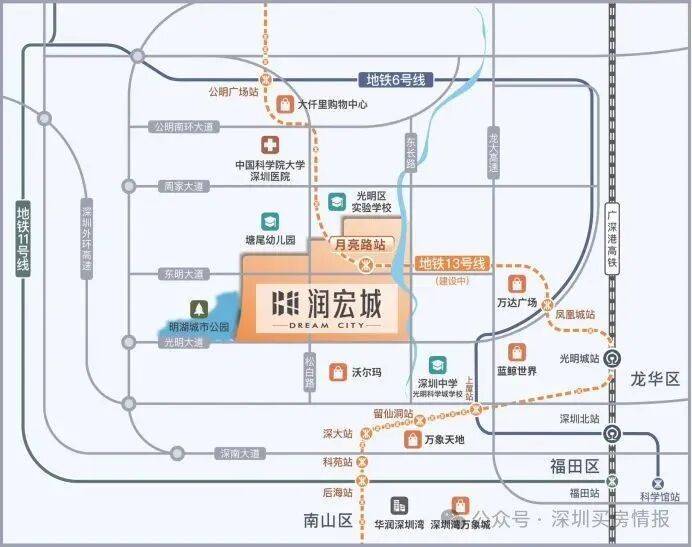润宏城位于深圳市光明区凤凰街道13号线二期月亮路站附近,由华润置地宏发集团联合打造,整体规划约382万㎡超大体量城市综合体,集轨道交通、优质教育、城市公园、创新产业、品质居住于一体,打造“宜居、宜业、宜游”都市生态标杆大城。