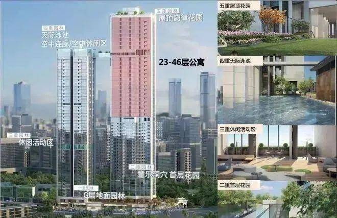 莱蒙水榭云上整体设计有五重立体花园,有地面园林、首层花园、休闲活动区、约133米高空“无边际泳池”,以及约166米高处的屋顶花园。这样的设计使建筑与生活更加结合,让业主从地面到空中不断跟“自然”相遇,每一层都能打开新的休闲空间。它冲向天际的地标级建筑,不仅为颜值而生,更是为生活方式而生。