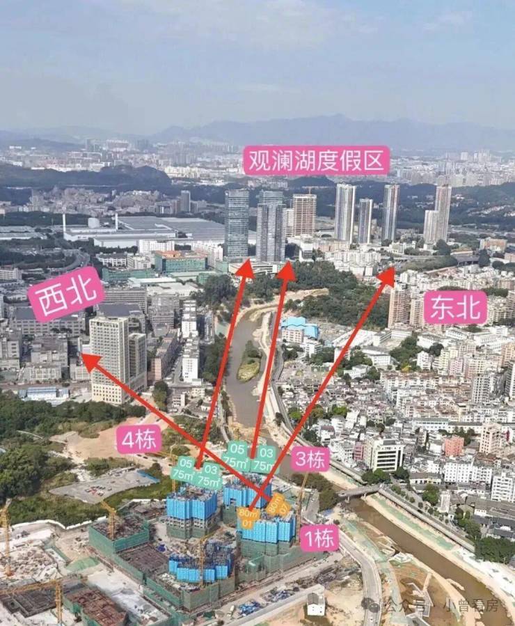 △3-4栋东北朝向75㎡可以看观澜河,高楼层可以看远处的观澜湖度假区视野还不错,1栋01的80㎡也是可以看到,但是可能会被旁边得3栋遮挡一部分视野没有3-4栋好,但是户型比较不错南北通透