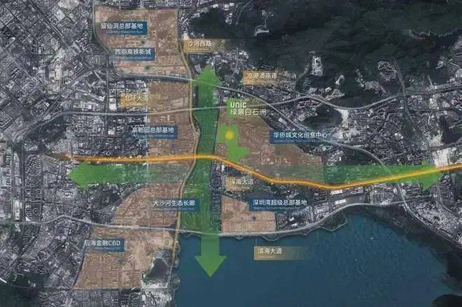 1条中央绿轴——约1.1公里中央绿轴,贯穿城区南北,南直至深圳湾,北接大沙河公园可至塘朗山。