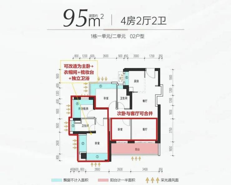 105㎡的4房2厅2卫:设计的是经典竖厅格局,客厅3.6米开间,四开间朝南,4个卧室分别做到了主卧17.59㎡/次卧9.5㎡/次卧8.93㎡/次卧7.75㎡(包含墙体飘窗),公卫带1个3.12㎡的设备平台,得房率约:100%(包含赠送),东南朝向看观澜河景观。