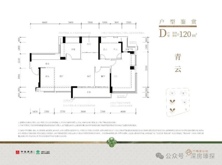 120㎡的4房2厅2卫,设计的是横厅南北通透格局,进门赠送约4.6㎡的入户玄关(不计算在户型图内),客餐厅6.35米开间,LDKB一体化设计,分别做到了主卧22.5㎡/次卧11.56m²/次卧9.52㎡/次卧8.25㎡(包含墙体飘窗),主卧带设备平台,客厅连接次卧出6.25米长大阳台,L型厨房,得房率约79.2%(不含赠送),阳台主朝东南向。套内面积94.63m²+赠送面积31.04m²=实用面积125.67m²,加上赠送后得房率约105.13%。
