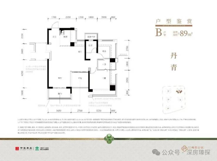 89㎡的4房2厅2卫,设计的是经典竖厅格局,进门入户玄关,客厅3.45米开间,动静分区,三开间朝南,分别做到了主卧14.54㎡/次卧7.96㎡/次卧7.56㎡/次卧5.8m²(包含墙体飘窗),主卧+1个次卧270°飘窗,U型厨房,公卫三段式干湿分离,得房率约102.2%(包含赠送),阳台5.52m²西南或东南朝向。飘窗赠送面积13.17m²+阳台赠送面积6.61m²+设备平台1.8m²=实际赠送面积约21.58m²。