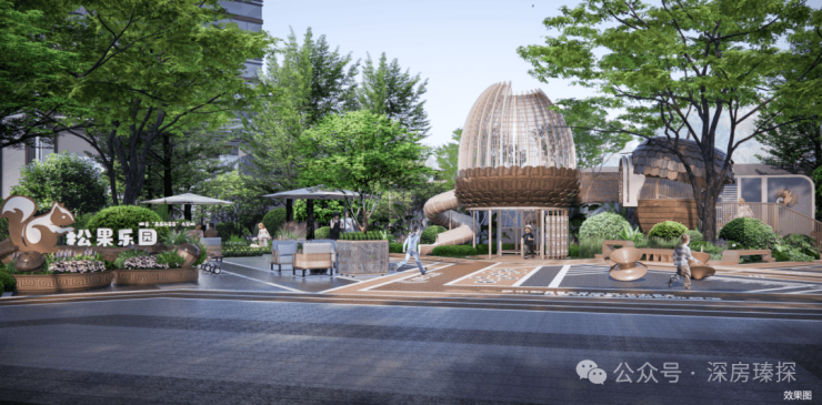 同时,设计萃取镬耳墙、蚝壳窗、海棠纹、拼花砖等岭南元素,将其转译为现代景观语言;引用“园中有园,园中多园”的布局灵感,规划全龄功能场地与五大主题架空层,让森系自然与风雅生活在此碰撞交融。