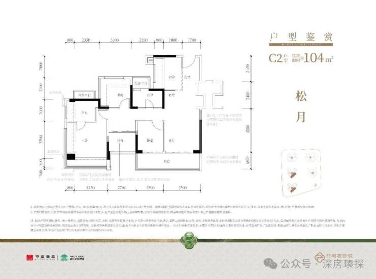 104㎡的4房2厅2卫,C1-C2户型,设计的是经典竖厅格局,进门入户玄关,客厅3.5米开间,LDKB一体化,S墙设计预留冰箱卡槽位,动静分区,四开间朝南,分别做到了主卧17.98㎡/次卧8.37㎡/次卧8.1m²/次卧7.75㎡(包含墙体飘窗),L型厨房,公卫干湿分离带1个约2m²的设备平台,得房率约79.2%(不含赠送),客厅连接次卧出9.6m²的观景大阳台,东南或西南朝向。套内面积82.58m²+赠送面积23.86m²=实用面积106.44m²,加上赠送后得房率约102.04%。