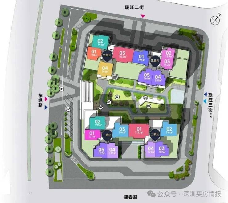 臻文府,由坪山本地房企六和集团打造,也是六和城二期,总占地面积约0.92万㎡,总建筑面积约6.85万㎡,计容建筑面积约5.32万㎡,容积率5.76,绿化率25%,共由4栋总高31层住宅组成,分别是1栋/1/2/3/4单元,另外配建1所9班制幼儿园。总规划520户,1栋1/4单元是2梯5户,1栋2/3单元是2梯4户,地下2层,停车位358个,停车位占比约1:0.69。