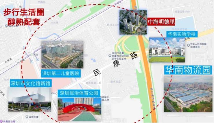 2)沿民康路两侧已陆续聚集了包括深圳市文化馆新馆(在建)、深圳第二儿童医院(已投入使用)、已开园的深圳民治体育公园等市政配套。