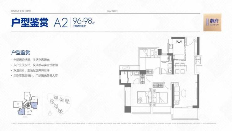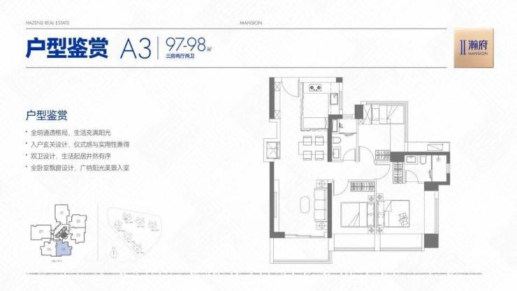 03/05/06(A2/A3)户型,竖厅三开间朝南格局,客厅3.5米开间,LDKB一体化,S墙设计预留冰箱卡槽位,主卧+1个次卧双飘窗。得房率约78%(不含赠送)。