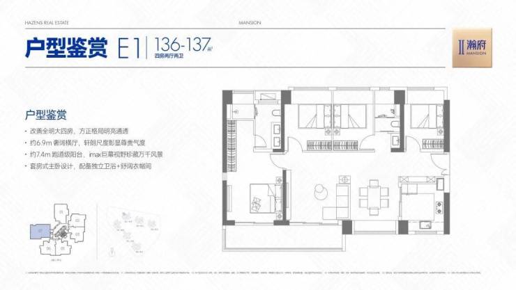 07(E1)户型,横厅朝西南,客餐厅开间6.9米开间,LDKB一体化设计,四开间朝南,全屋7面飘窗,主卧套房+步入式衣帽间,3个次卧朝东北向,客厅连接次卧出7.4米长的超大阳台。得房率约78%(不含赠送)。