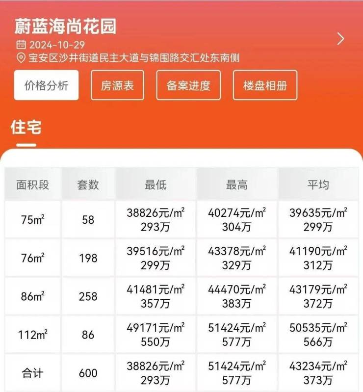 宝安沙井,卓越前海未来城(备案名:蔚蓝海尚花园)在2024年10月29日首推2栋1/2单元,共600套房源,后面在2025年4月18日加推1栋1/2单元,共588套房源,面积有63㎡的2房1卫,76㎡的3房1卫,86㎡的4房2卫,113㎡的4房2卫户型,总入市1188套房源,备案均价4.57万/㎡,备案单价3.88-5.15万/㎡,总价272-583万/套,合同约定在2026年12月份带精装交房。