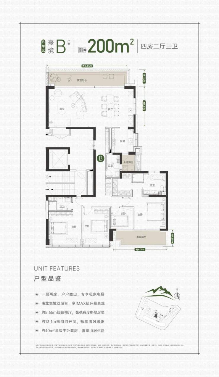 同样的专梯入户,豪宅感扑面而来,尤其是约10.55米的大横厅,空间奢阔气场尽显,罕见的南北瞰景四阳台设计,让家的每个角落都能欣赏美丽的山景和城市景观。所有的开窗面都尽可能放大,客餐厅、书房、卧室、几乎都能享受超宽超大屏。