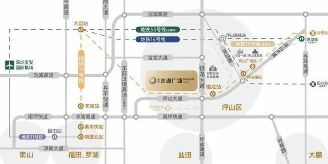 地铁:紧邻地铁14快线坪山门户站——锦龙站(约600米),12站福田岗厦北。周边临近地铁16号线(14号线一站直达坪山围站换乘)、地铁19号线(规划中)、地铁33号线(在建)。