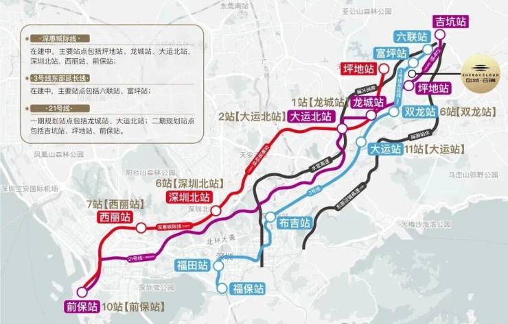 深惠城际轨道线-坪地站(在建中,预计2026年开通);未来1站龙城、2站大运、7站南山,畅联前海、西丽高铁枢纽站和深圳北高铁枢纽站。