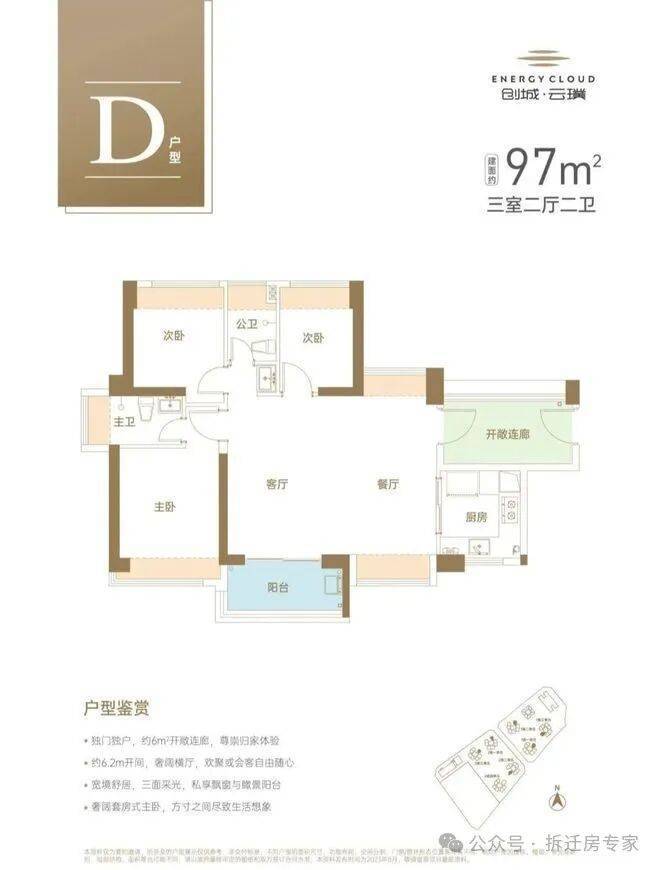 建面约97㎡独门独户3房2厅2卫,三面采光设计,室内阳光超长待机,约6.2m大开间横厅,出入步履无拘。