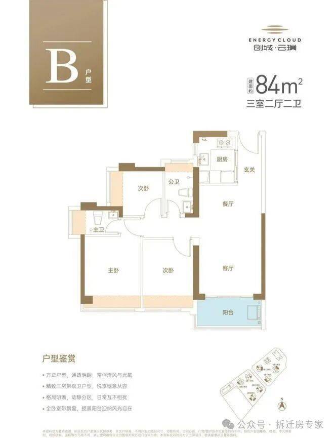 建面约84㎡硬核3房2厅2卫,餐客厅一体,更显开阔大气,动静分区,同等面积多一卫。