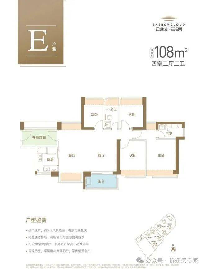 建面约108㎡南北通透4房2厅2卫,阔绰大横厅,演绎多样家庭生活场景,东南向户型,3面采光,生活洒满阳光。