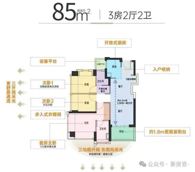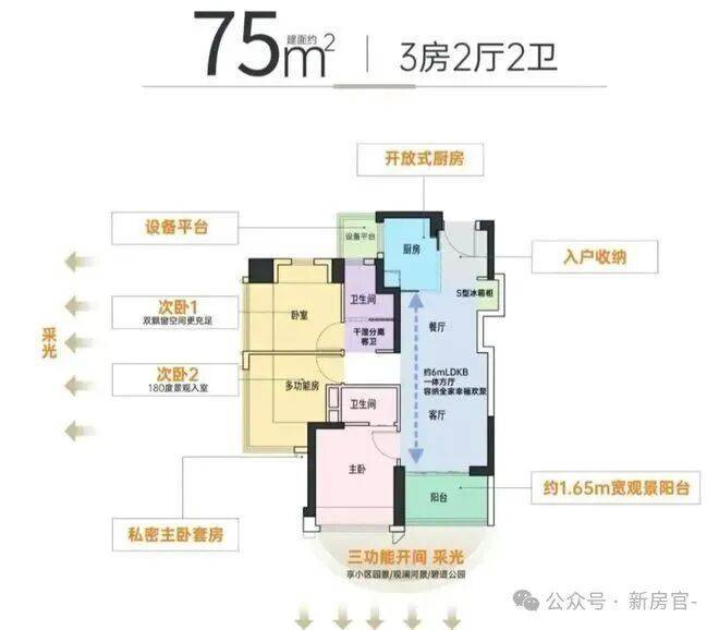 新规升级75㎡做2卫,市场同面积做1卫,卧室180度环幕采光,S型墙体设计冰箱位,使用空间更合理,干湿分离两空间公卫,兼并走廊空间更宽阔,客餐厅一体化设。
