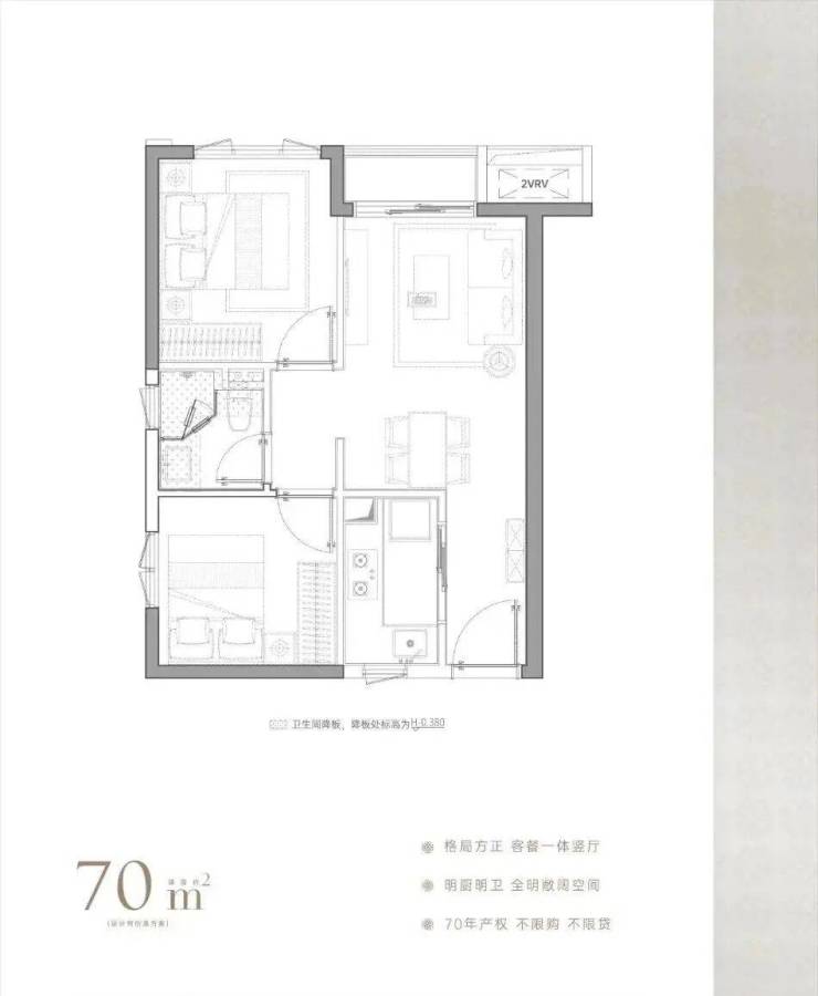 建面约70㎡,标准竖厅格局,明厨明卫,贴近住宅家庭生活需求;每个功能空间尺度都很开阔,居住体验更好,可以作为核心区住宅的“小户型平替”。预计租金水平约9000元/月。