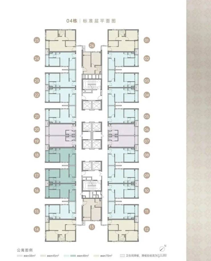 住宅由4栋48层建筑组成,分别是1栋、2栋1/2单元和3栋,3梯5/6户,4栋是商务公寓45F(1470户),5栋是幼儿园。