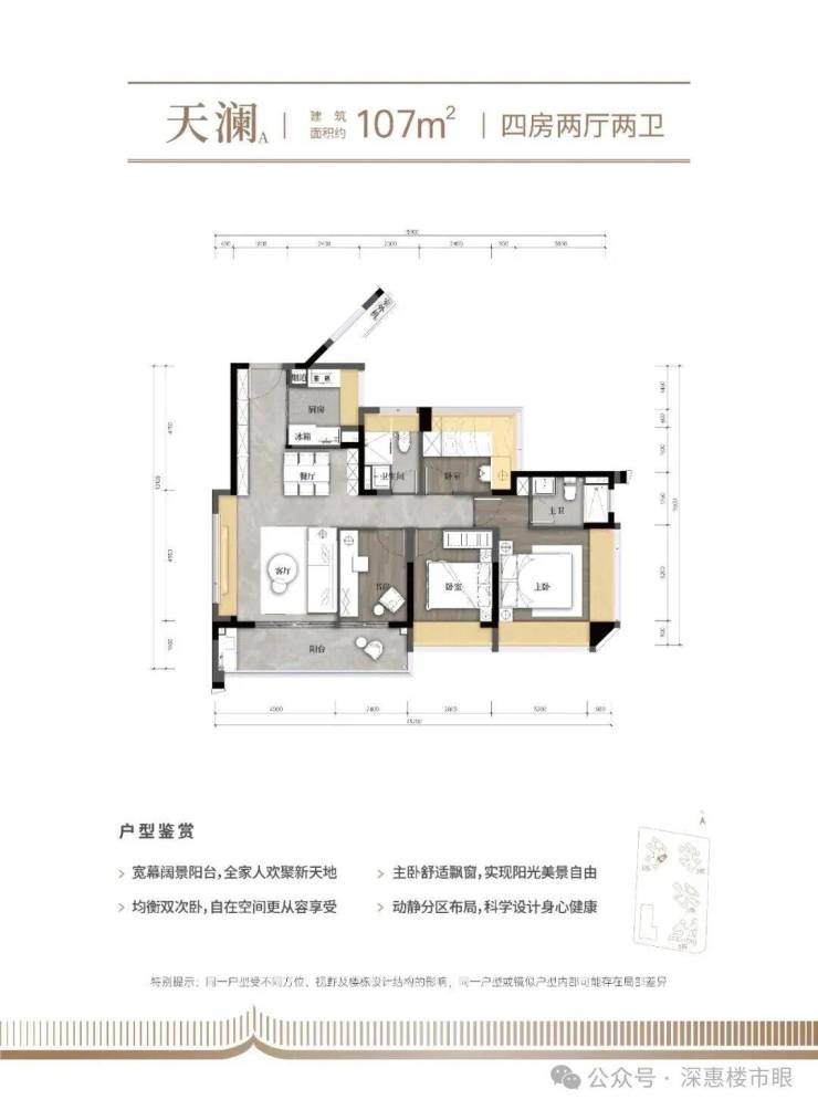 107㎡的4房2厅2卫,设计的是经典竖厅格局,客厅4米开间,LDKB一体化,S墙设计预留冰箱卡槽位,动静分区,分别做到了主卧17.18㎡/次卧11.2㎡/次卧8.64m²/次卧7.68㎡(包含墙体飘窗),U型厨房,卫生间干湿分离,得房率约79.1%(不含赠送),客厅连接次卧出10.24m²观景大阳台,东南朝向。套内面积84.62m²+赠送面积22.96m²=实用面积107.58m²,加上赠送面积后得房率100.51%。