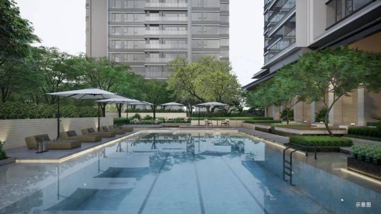 【自然水岸游泳池】:约400㎡无界亲子多元互动型泳池,与7栋架空层联动,在架空层内布置淋浴更衣、消毒池等功能,与周边绿化融合,无硬边界,绿植做隔断,旁边设置跌水景观。