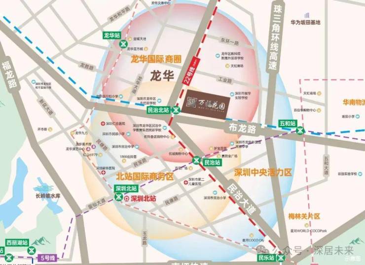 万福花园位于龙华民治街道,布龙路与民治大道交汇处,距离深圳北站近约2.5公里,又位于龙华国际商圈内,依托时代发展,板块迅速崛起,项目所在的民治板块,作为深圳都市核心区的核心区域,是龙华“一圈一区三廊”中央活力区的核心区域,对标福田,南山,罗湖等中心区,集齐了总部经济、金融、科技、文化、购物、休闲、国际商务、创新、生态等功能。