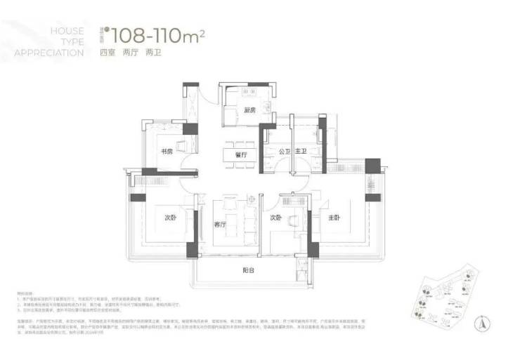 108-110㎡的4房2厅2卫:竖厅双龙抱珠格局,客厅开间3.5米,LDKB一体化,4个卧室分别做到了3.7米/3.4米/2.8米/2.6米的宽度,主卧加2个次卧270°全景飘窗,客厅连接次卧出6.1米长的大阳台,U型厨房,得房率约95-97%(包含赠送),西南或东南朝向。户型分布在1栋1/2/3单元03/04户型,03户型东南朝向,04户型西南朝向;只有2栋2/3单元看小区,其他都看向小区外部;