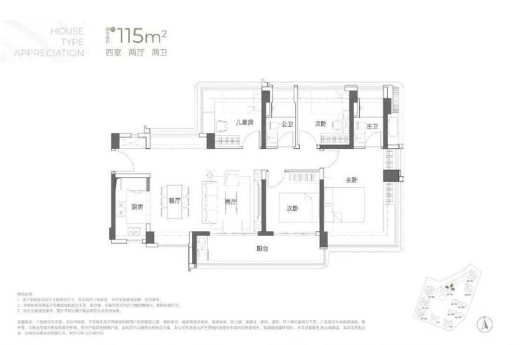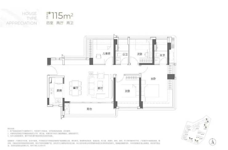 115㎡的4房2厅2卫:横厅南北通透格局,客餐厅6米开间,LDKB一体化,全屋飘窗,4个卧室分别做到了3.9米/3米/2.8米/2.6米的宽度,主卧加1个次卧270°全景飘窗,客厅出6米长的大阳台,L型厨房,得房率约95-97%(包含赠送),西南或东南朝向。115平米户型分布在1栋1单元、1栋2单元、1栋3单元01/02户型,01户型西南朝向都是看小区外围,02户型看向小区;