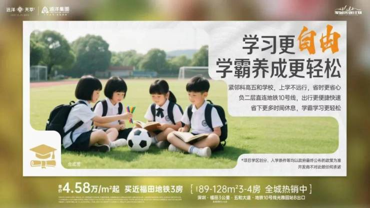 教育上,项目自带1所幼儿园,北侧地块还规划有1所18班制幼儿园;根据龙岗区教育局的学区划分,小学学区为深圳科学高中五和实验学校小学部距离约700米;初中学区包括深圳科学高中五和实验学校初中部、扬美实验学校初中部、云端学校初中部、深圳实验学校坂田校区初中部等。(具体入学,以当年区教育公示为准)