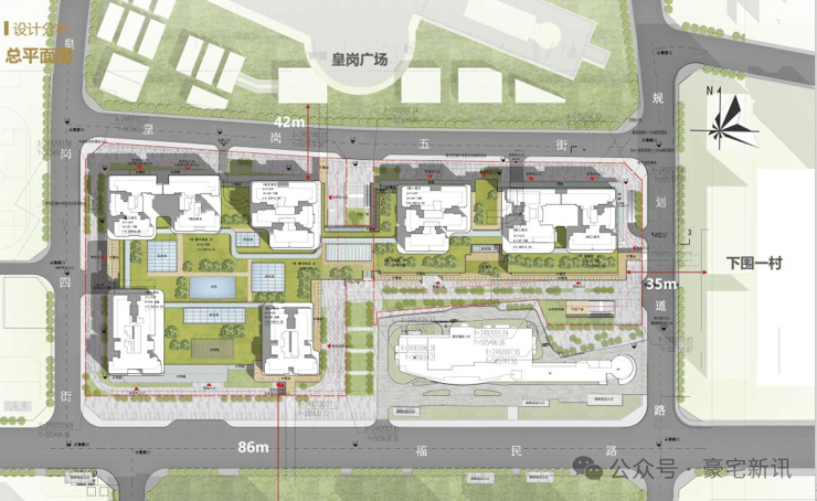 项目一期由福民路、皇岗二街、皇岗四街、皇岗五街围合而成,总占地面积约3.14万㎡,总建筑面积约27.3万㎡,住宅建面约为20.3万㎡,商业建面约为7万㎡;整个项目以“立于城市中轴,缔造时代标杆”为核心理念,旨在构建一个融合现代与历史人文特色的城市大综合体。