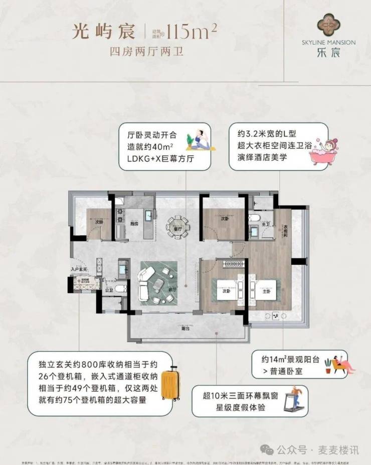 115㎡的4房2厅2卫,设计的是竖厅南北通透格局,进门入户玄关,客厅4.45米开间,餐客厅分离设计,分别做到了主卧23.45㎡/次卧8.96㎡/次卧7.84㎡/次卧7.68㎡(实测面积),客厅连接次卧出10.87m²的观景大阳台,L型中式+岛台灵动式厨房