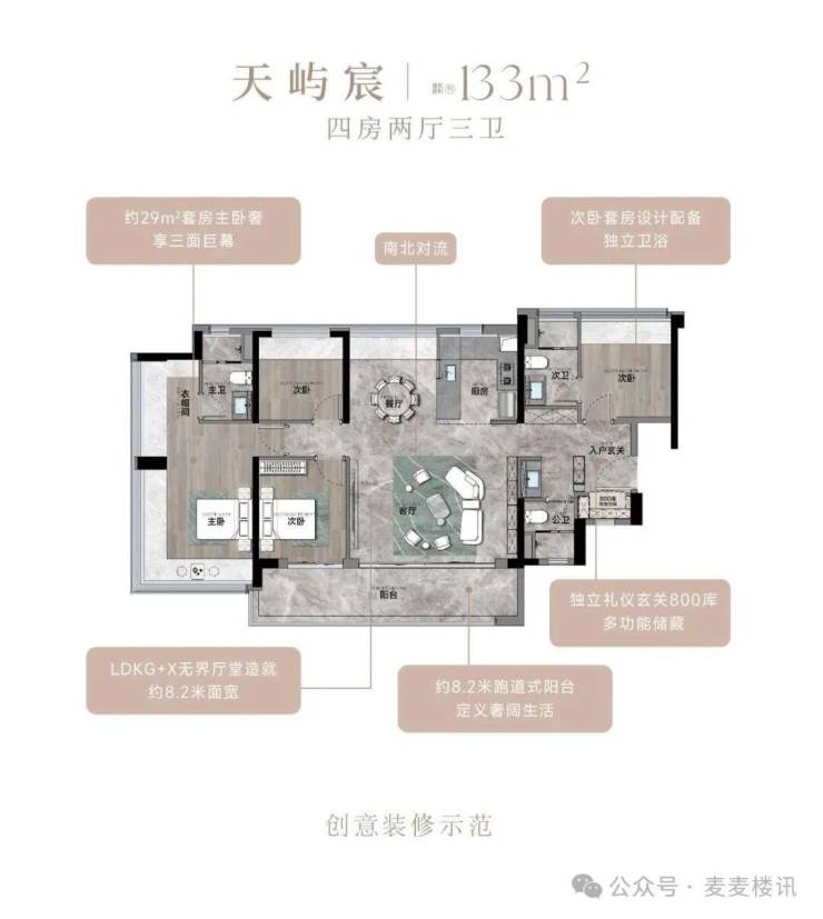133㎡的4房2厅3卫,设计的是竖厅南北通透格局,进门入户玄关,客厅5.4米开间,餐客厅分离设计,分别做到了主卧24.5㎡/次卧10.2㎡/次卧8.96㎡/次卧7.84㎡(实测面积),客厅连接次卧出12.3m²的观景大阳台,L型中式+岛台灵动式厨房