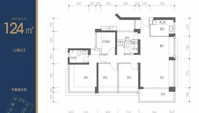 124㎡的4房2厅2卫,此户型为东南朝向,设计的是经典竖厅格局,客餐厅位都设计了飘窗,就是为了争取更多的赠送,动静分区,四开间朝南,主卧270°观景飘窗,L型厨房,公卫三段式分离,得房率约88%(包含赠送)。
